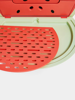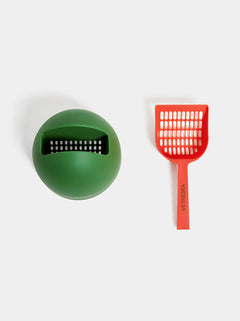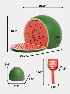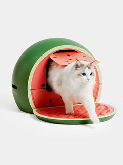 Un bac à litière couvert en forme d'alcôve, conçu pour les chats, alliant intimité et facilité d'entretien. Inspiré par la forme d'une pastèque, ce bac à litière comprend un tiroir amovible, un système anti-odeurs et une pelle assortie pour un nettoyage quotidien pratique.