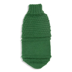 This knitted dog sweater is made from an alpaca blend yarn and offers a soft, warm layer for cooler seasons. It features a ribbed turtleneck and a flexible knit that allows your dog to move comfortably. A small opening on the back provides access for attaching a leash.