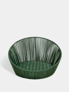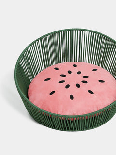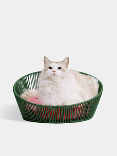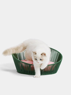 A handwoven rattan pet bed designed for cats and small dogs. Made with durable PE rattan, this lightweight bed includes a removable cushion for comfort in all seasons.